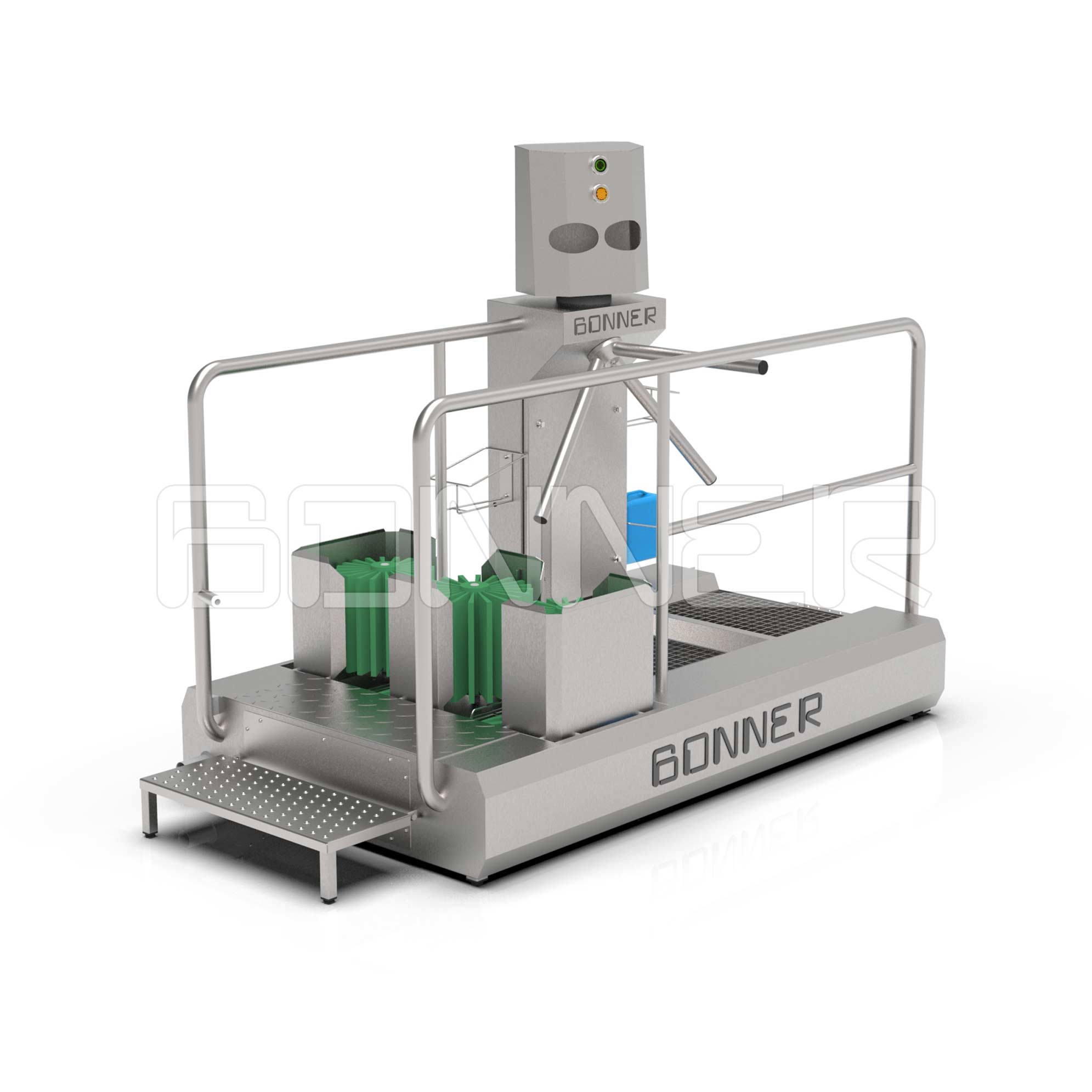 Изпълнение от неръждаема стомана AISI 304 (1.4301); Съоръжението включва следните елементи: Модул за измиване на ботуши с три вертикални и две хоризонтални четки с автоматично задействане. Вана за дезинфекция на подметки на две нива със зона за откапване; Дезинфектор за ръце: дезинфекцията се извършва чрез напръскване на ръцете с дезинфекционен препарат; Въртящ се кръст: осигурява преминаване през съоръжението само, ако е извършена правилно дезинфекцията на ръцете на преминаващия.
