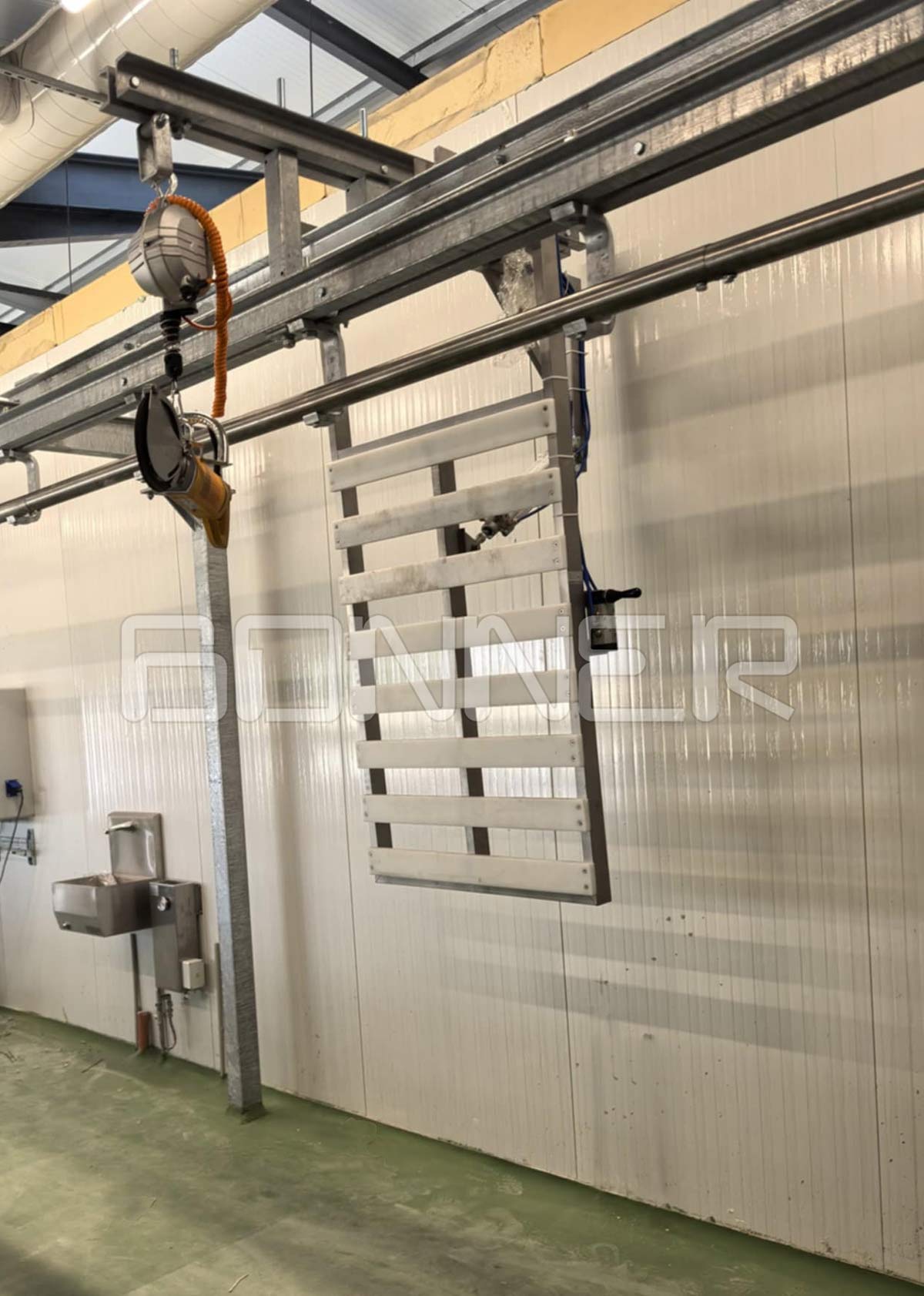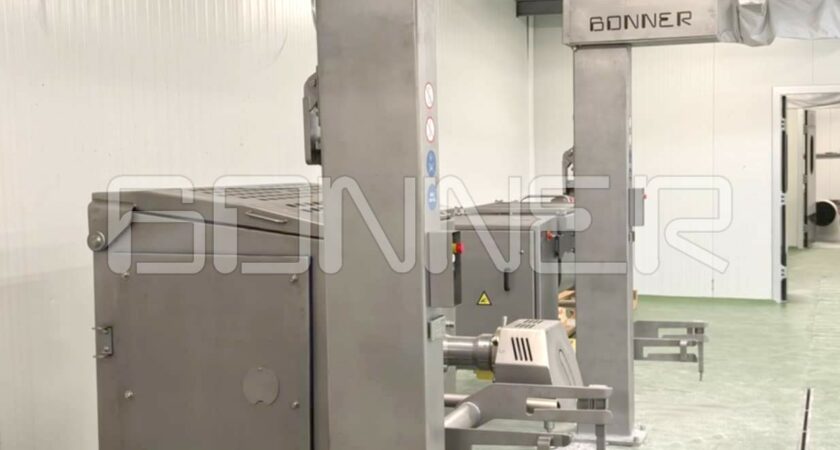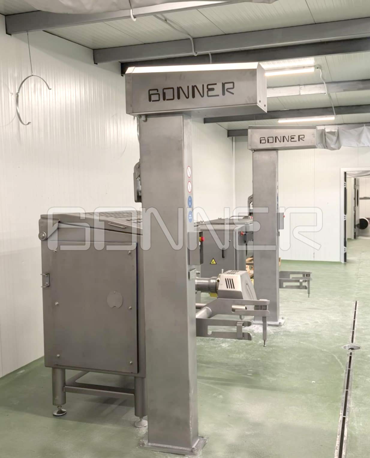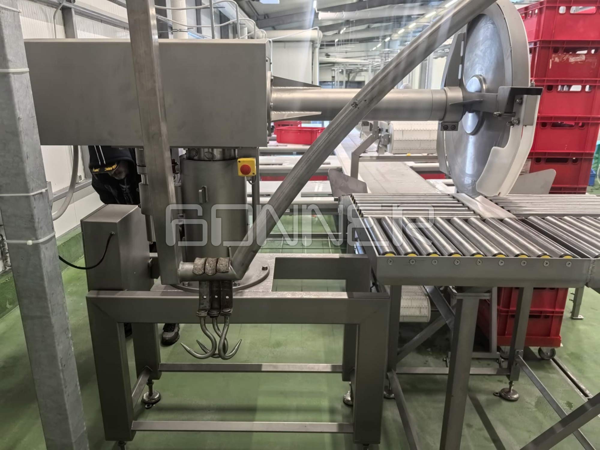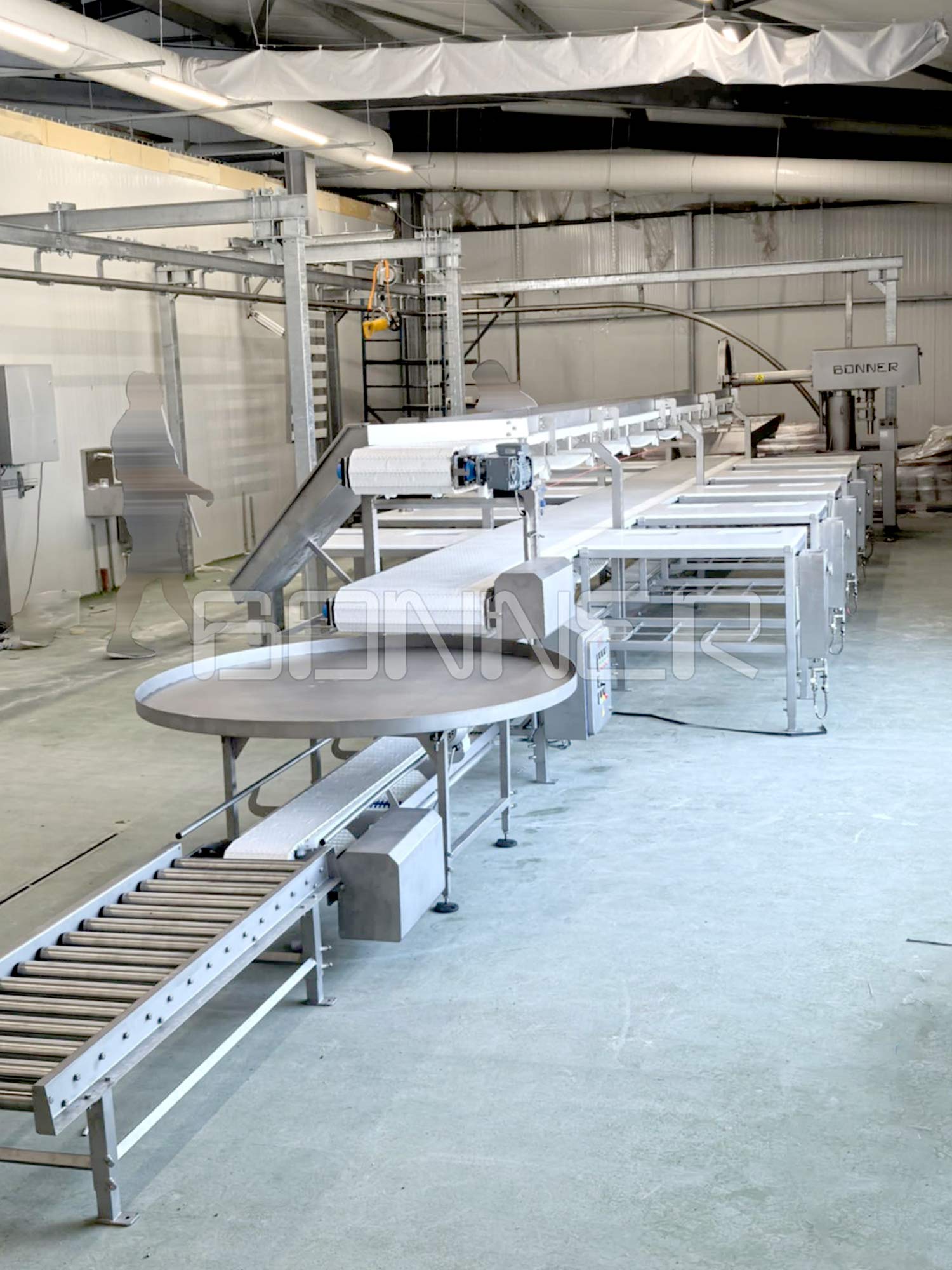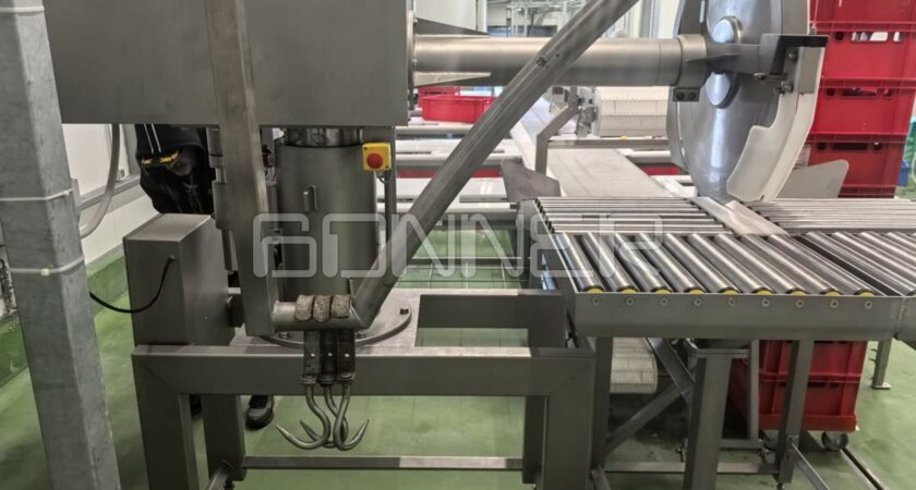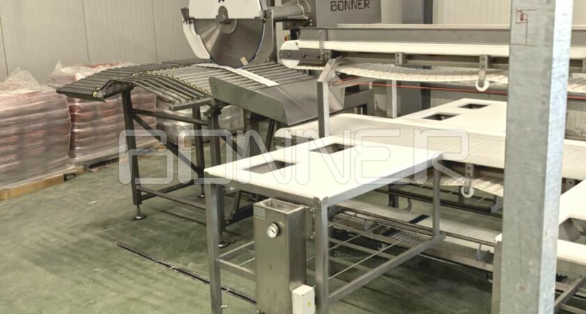 - Belt conveyor for feeding meat to the work stations;