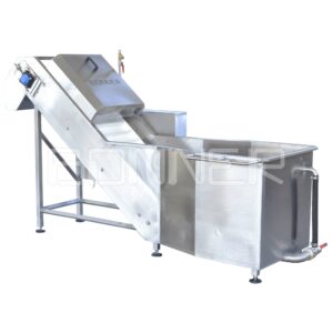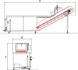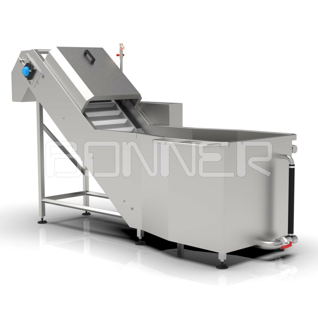 Initial washing is done in a bathtub by processing with compressed air. Rinsing is done over an outgoing conveyor by a collector with nozzles.