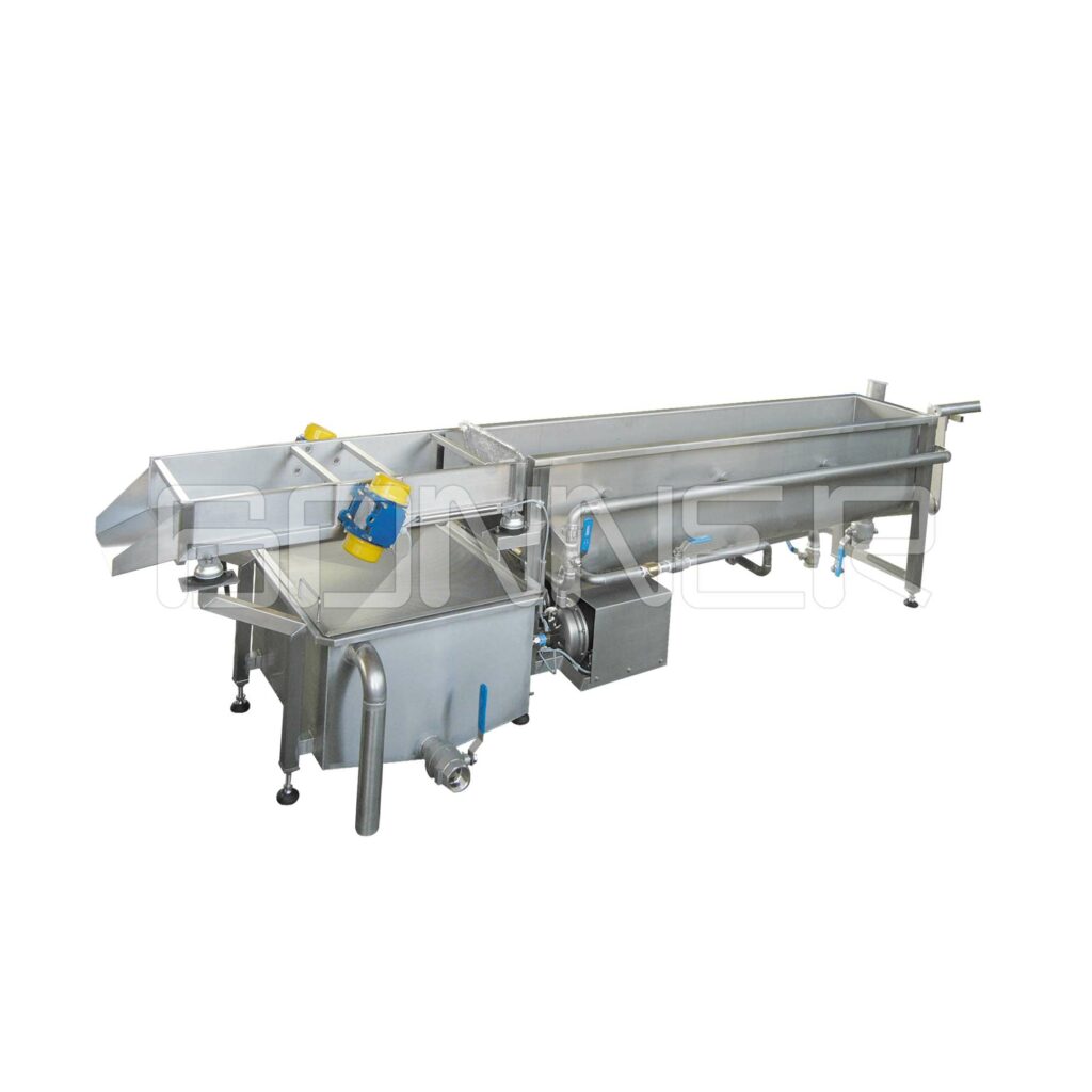 Made of stainless steel. Designed for washing vegetables by stirring them. Movement of the water is accomplished by two pumps. Consecutive binding of two or three machines is possible. Manual operating.